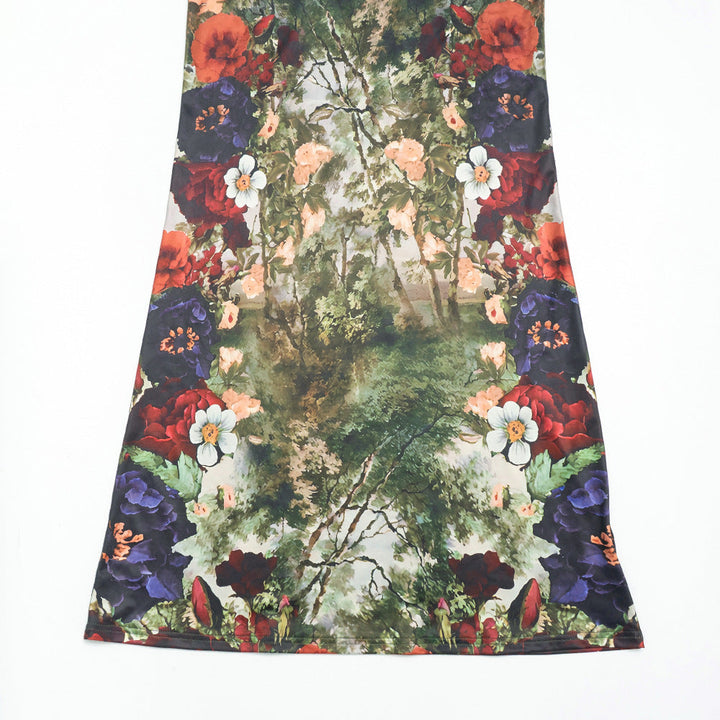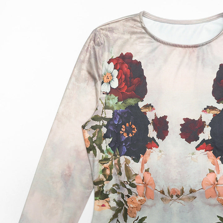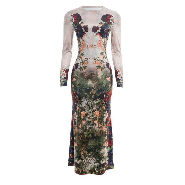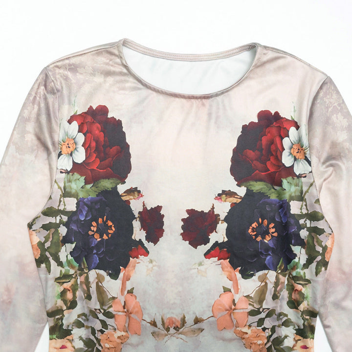 Flower print long sleeve crewneck maxi dress