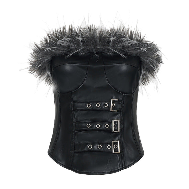 Fluffy zip-up buckle PU leather tube top
