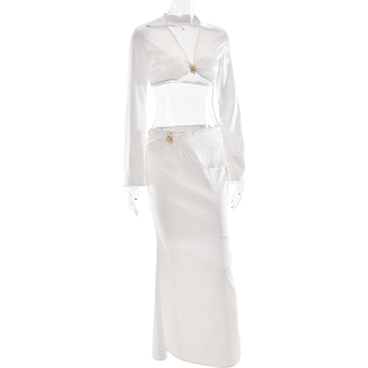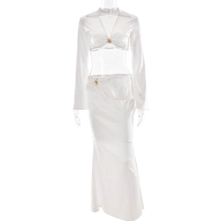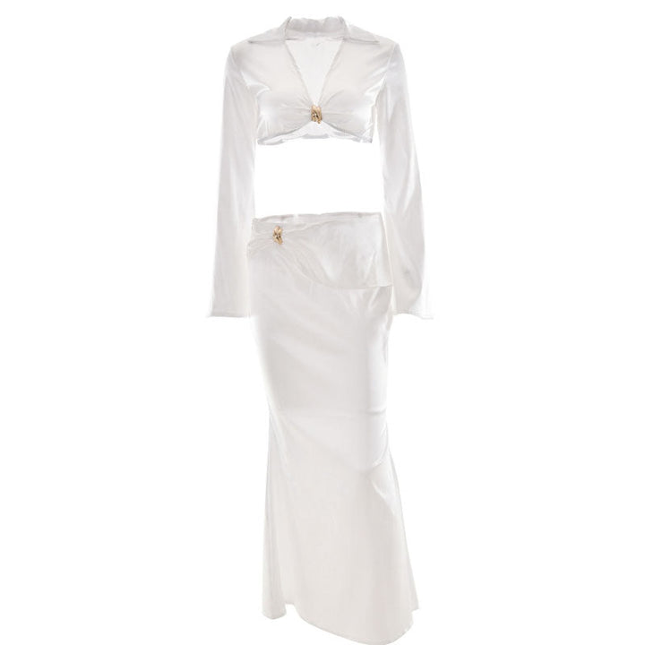 Satin long sleeve v neck maxi skirt set