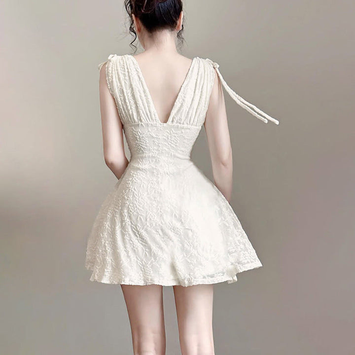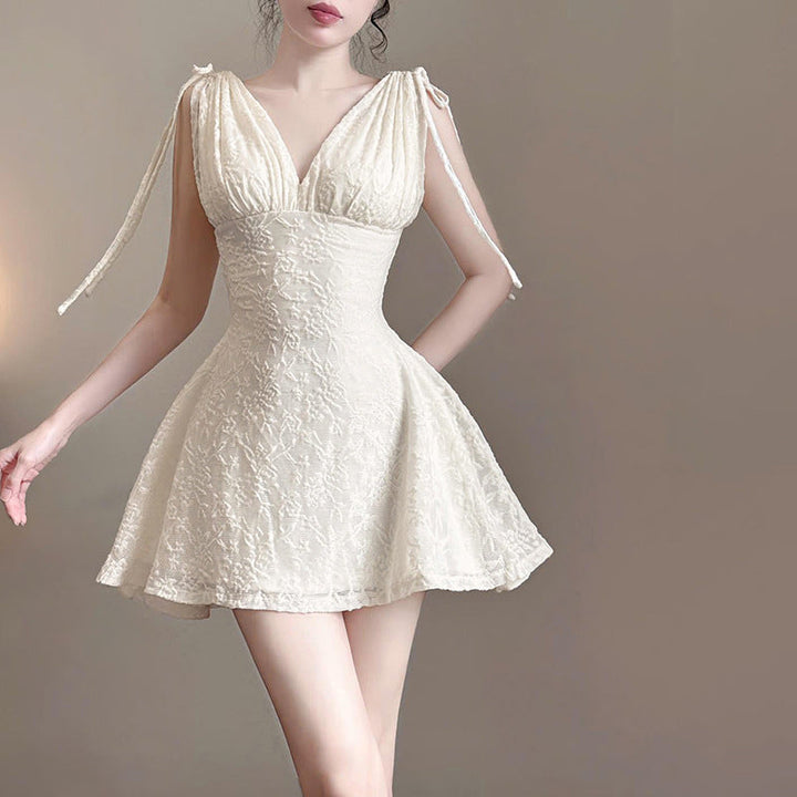 Self tie v neck lace solid mini dress