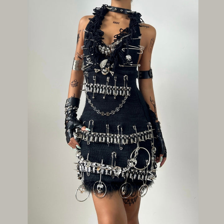 Halter fluffy skull applique backless mini dress