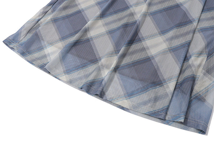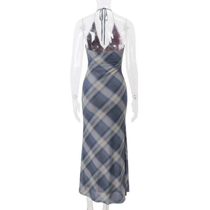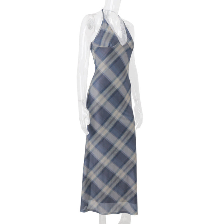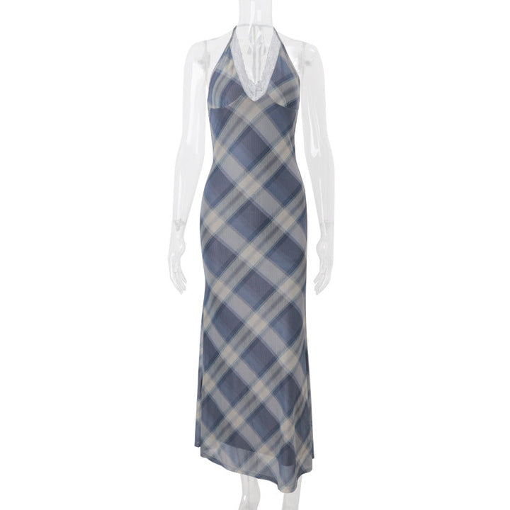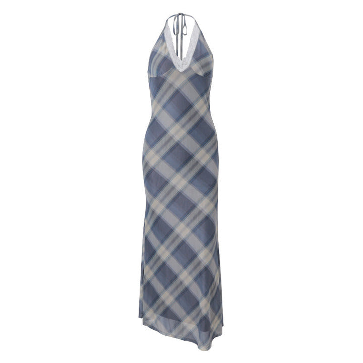 Lace hem v neck halter self tie plaid maxi dress