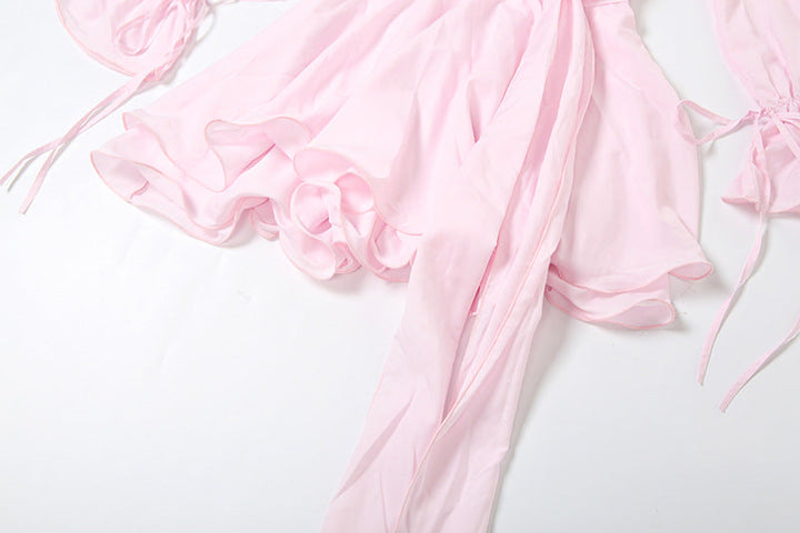 Long flared sleeve flower applique ruched ruffle mini dress