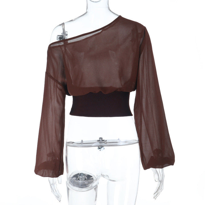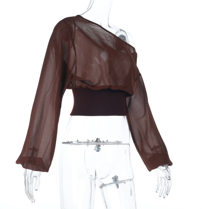 Long sleeve irregular see through one shoulder top