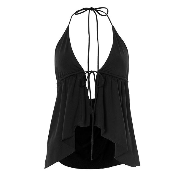 Ruffle bowknot v neck skull applique self tie cami top