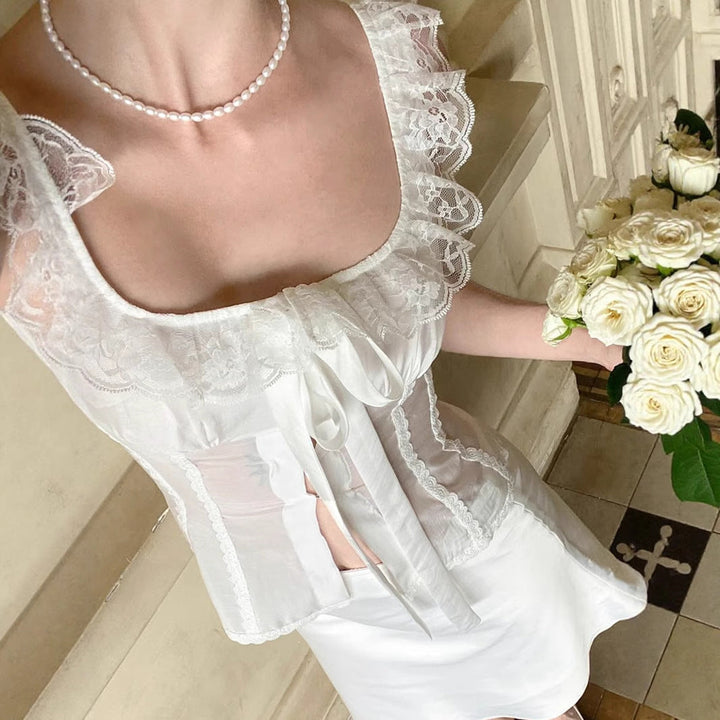 Bowknot lace hem ruffle square neck top