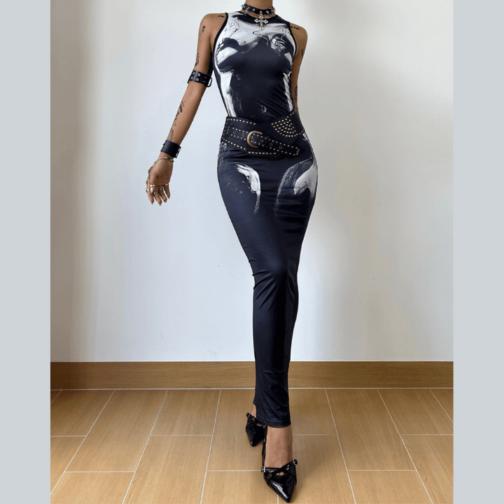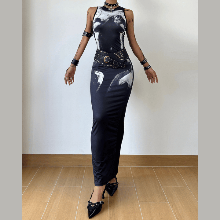 Vestido largo sin mangas en contraste con estampado corporal y cuello redondo