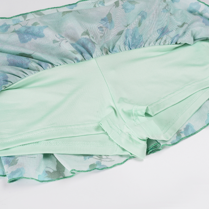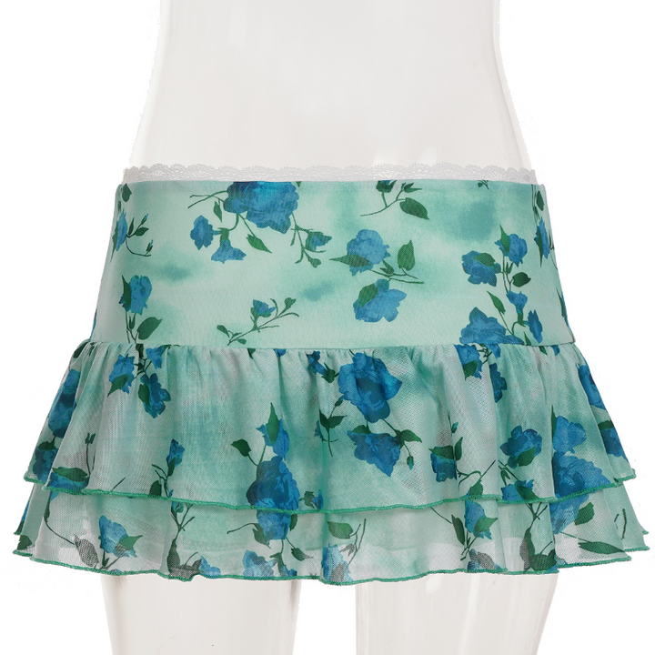 Flower print lace hem bowknot ruffle mini skirt