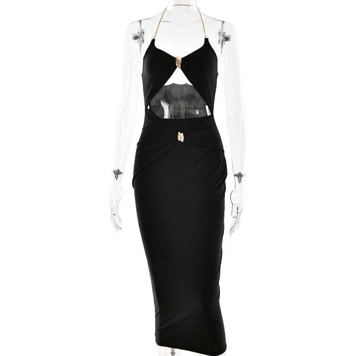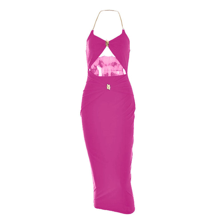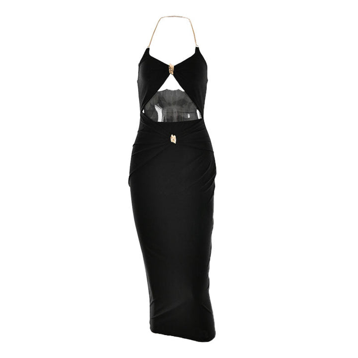 Halter metal chain hollow out ruched midi dress