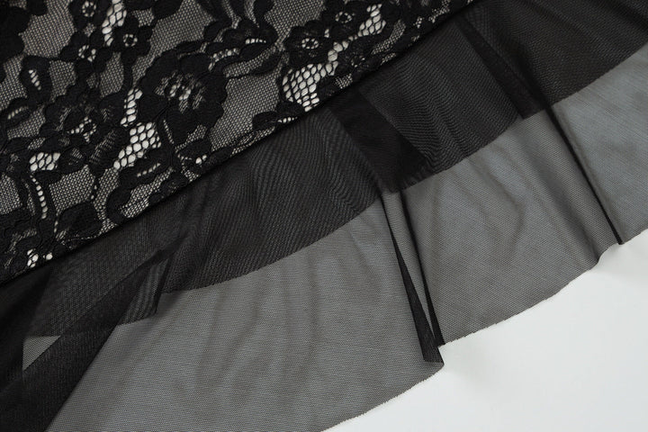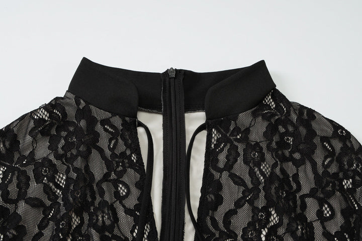 Irregular hollow out self tie zip-up lace midi dress