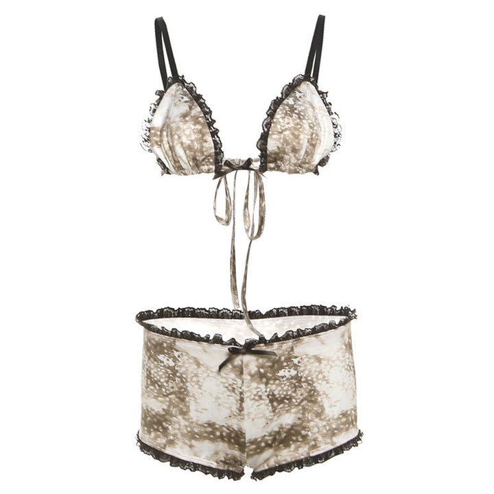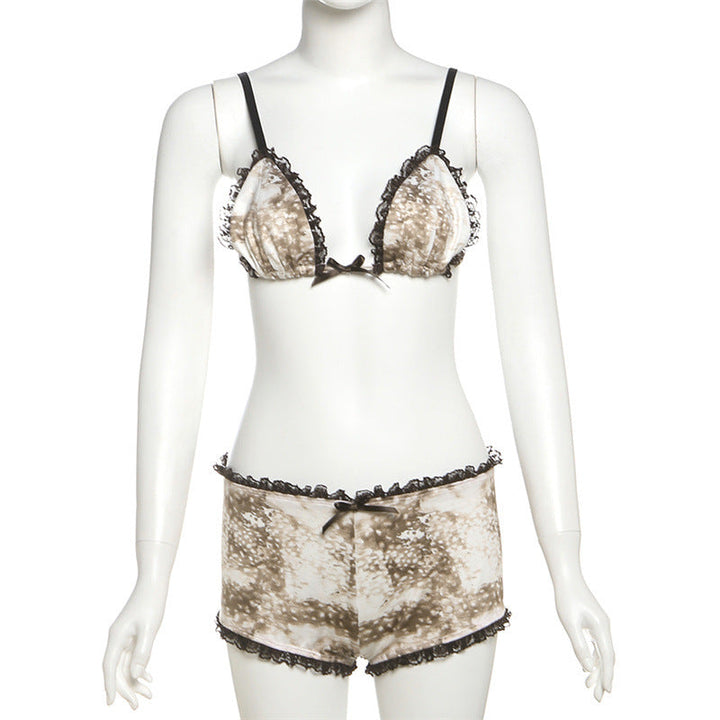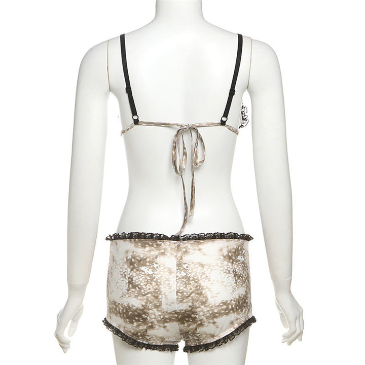 Lace hem bowknot self tie print pant set