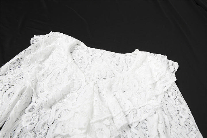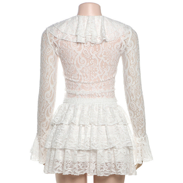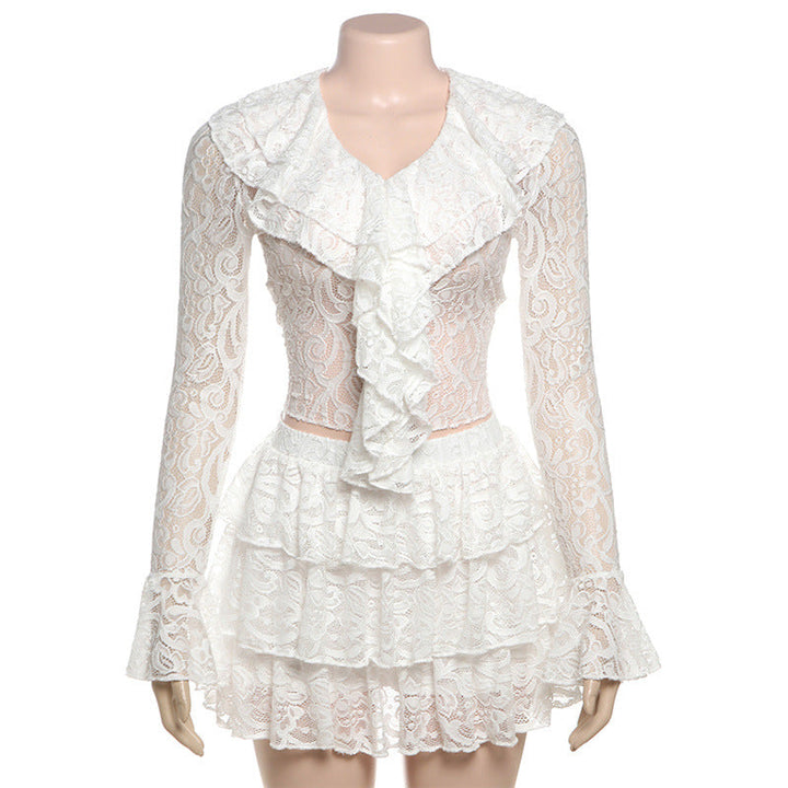 Long flared sleeve lace ruffle v neck mini skirt set