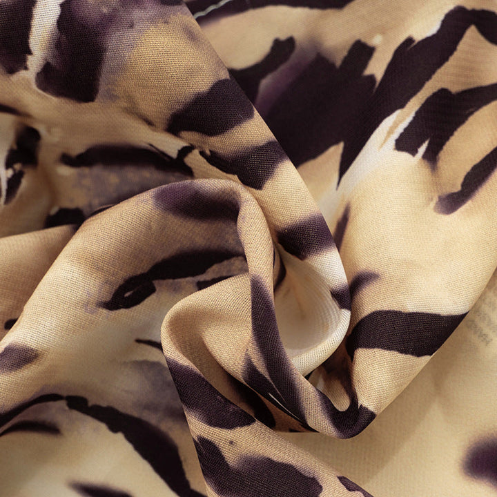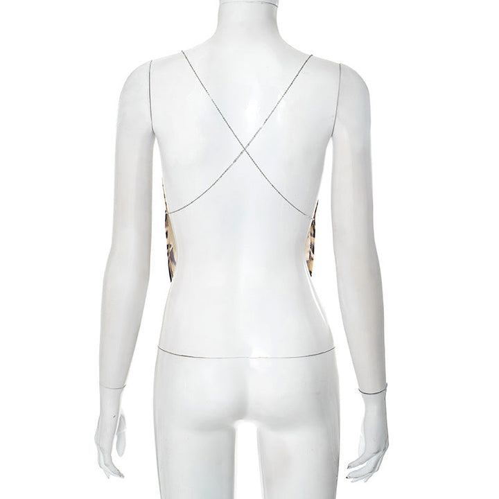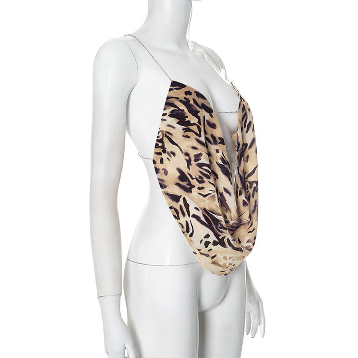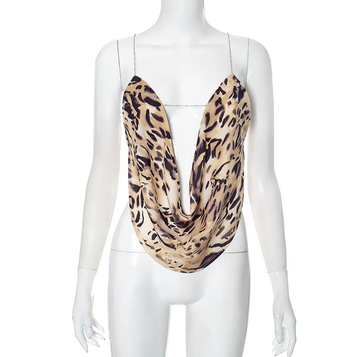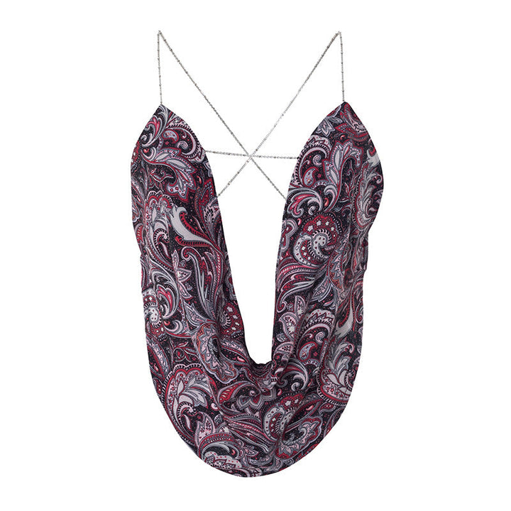 Metal chain cross back cowl neck print top