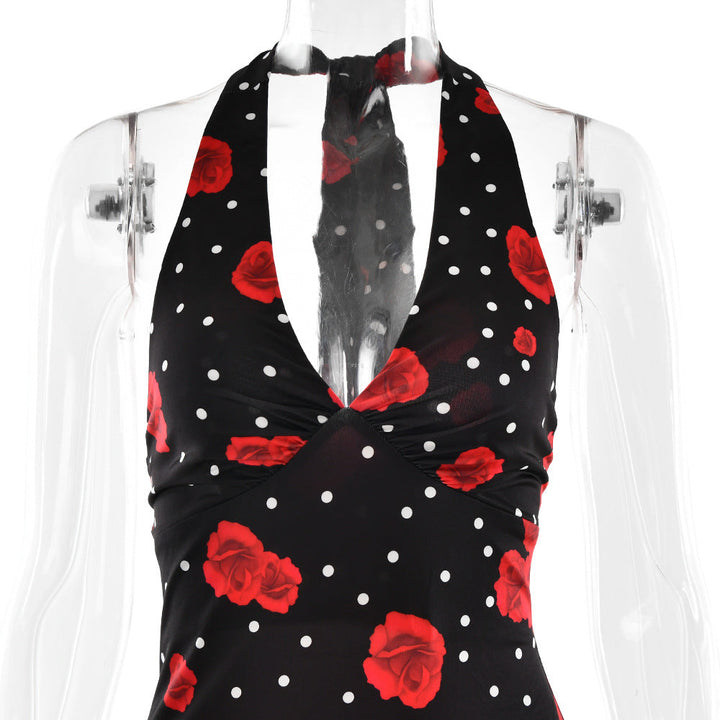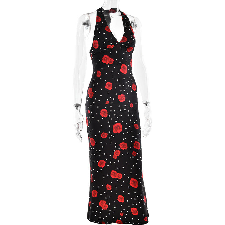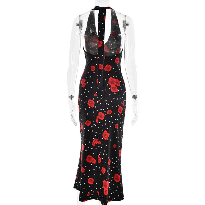 Polka dot flower print halter maxi dress