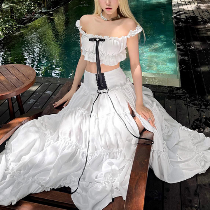 Slit ruffle lace up ruched white maxi skirt