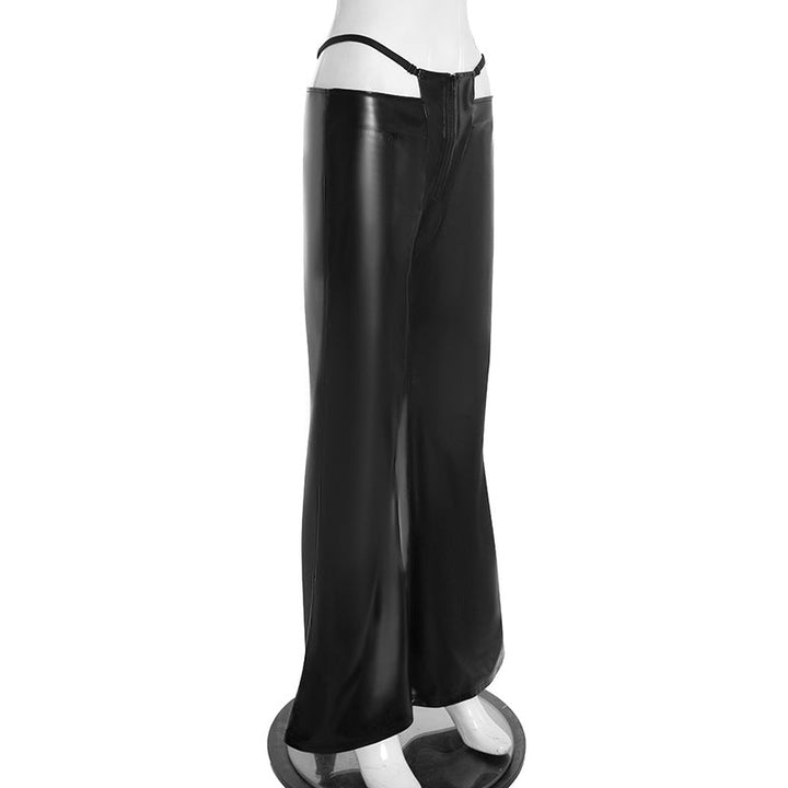 Zip-up PU leather hollow out wide leg pant