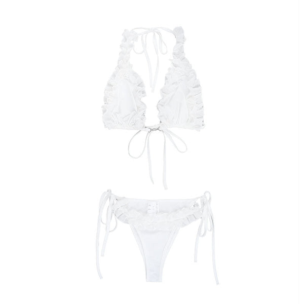 Halter off shoulder long sleeve ruffle metal applique mini dress