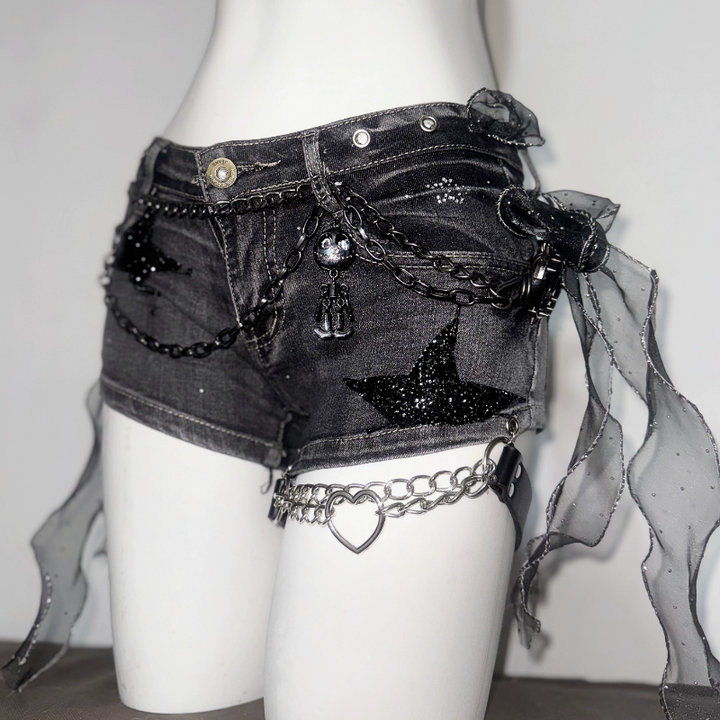 Button zip-up metal chain denim shorts
