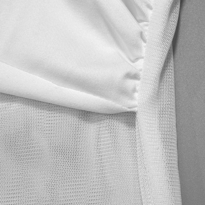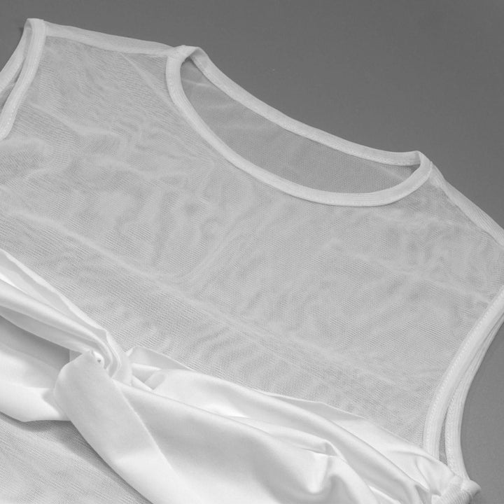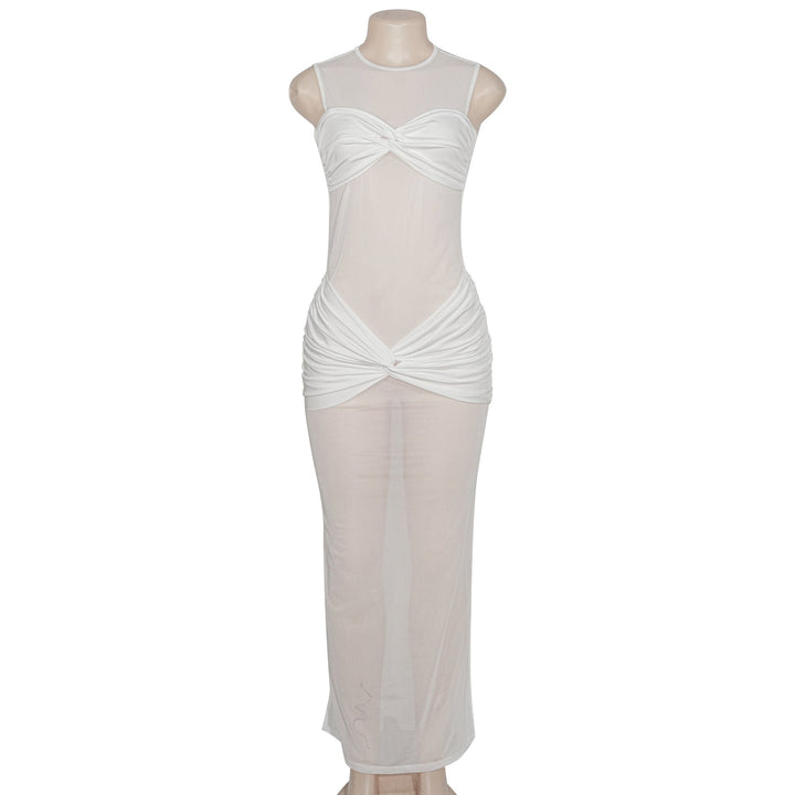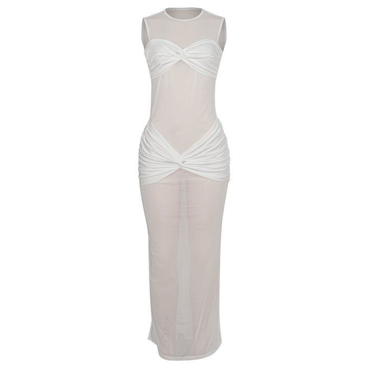 Crewneck sleeveless mesh patchwork ruched maxi dress