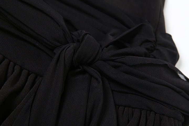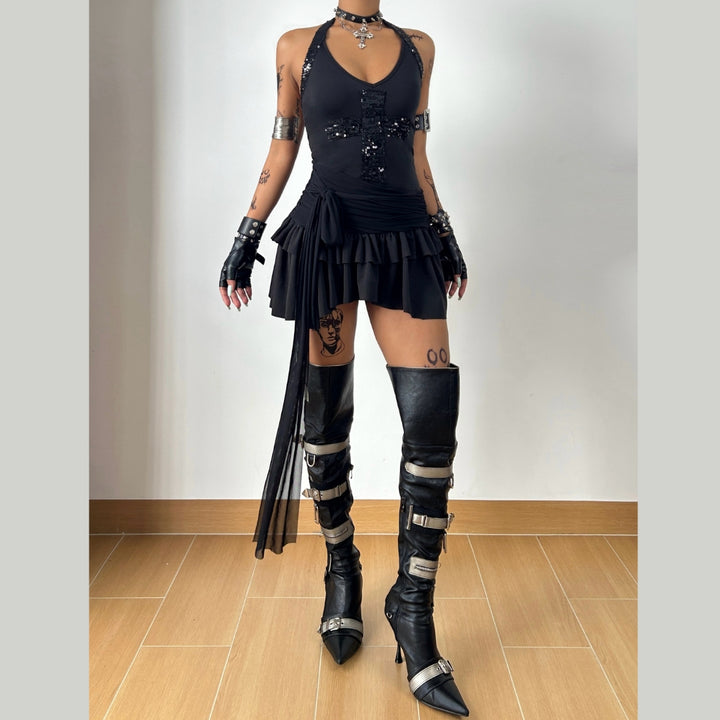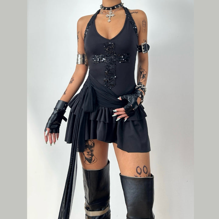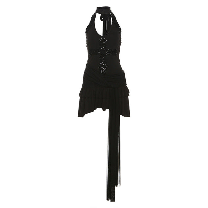Glitter halter self tie v neck solid mini dress