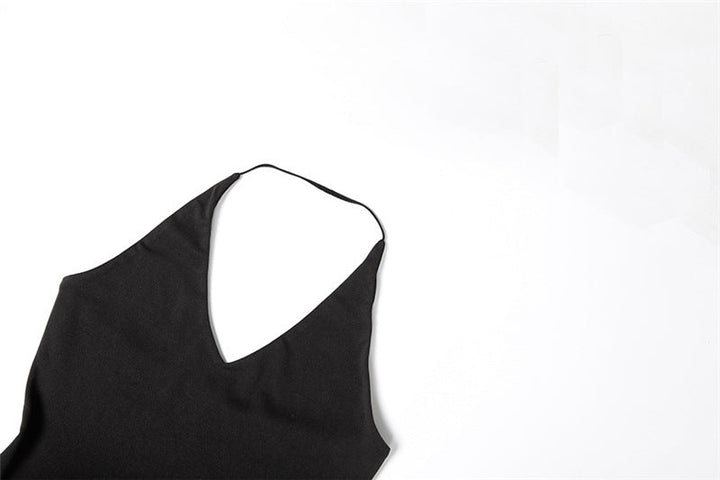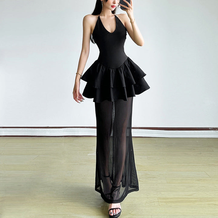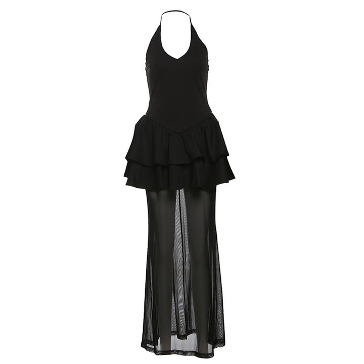 Halter v neck mesh ruffle solid maxi dress