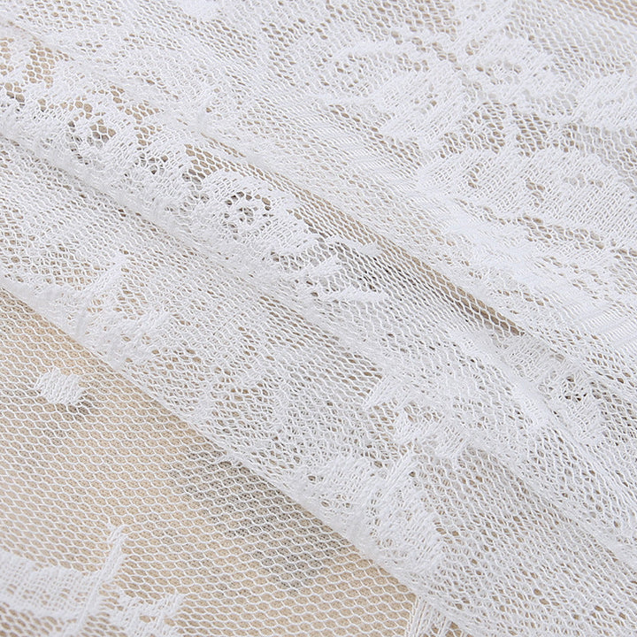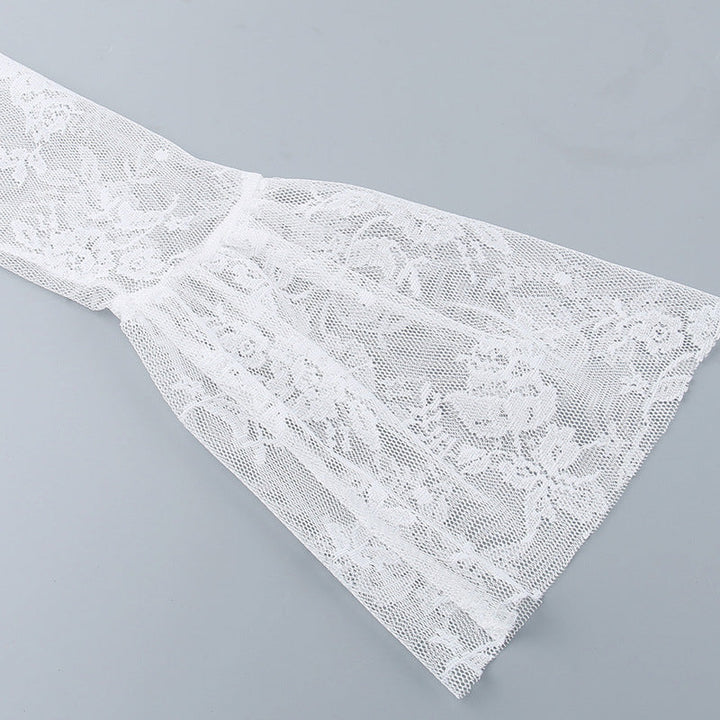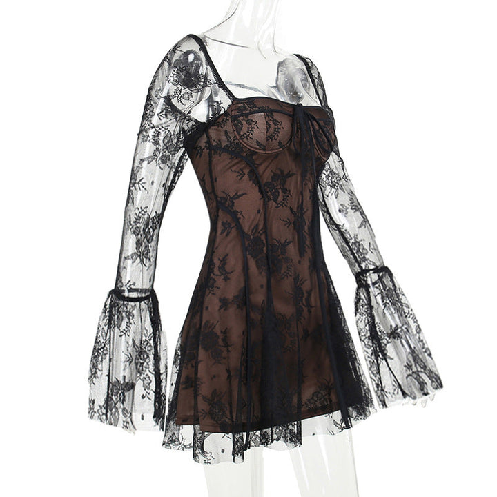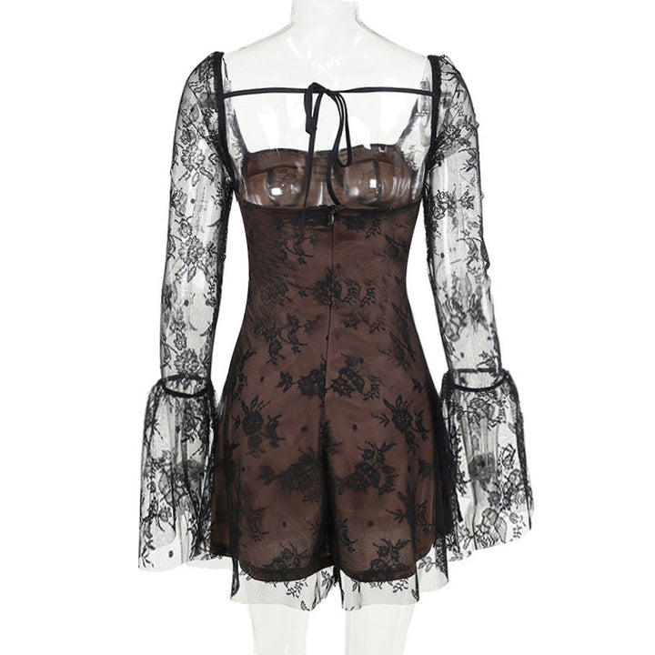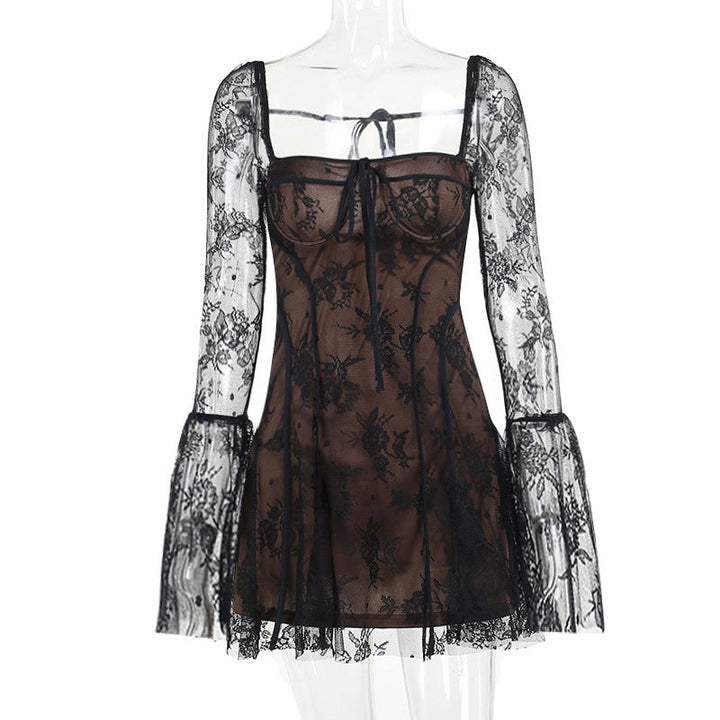 Long flared sleeve lace self tie zip-up mini dress
