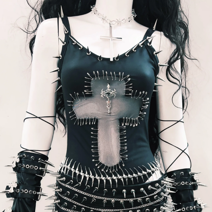 Mesh u neck rivet applique cami bodysuit