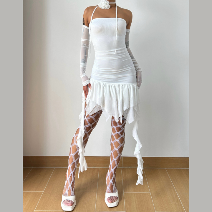Off shoulder ruched long sleeve solid mini dress