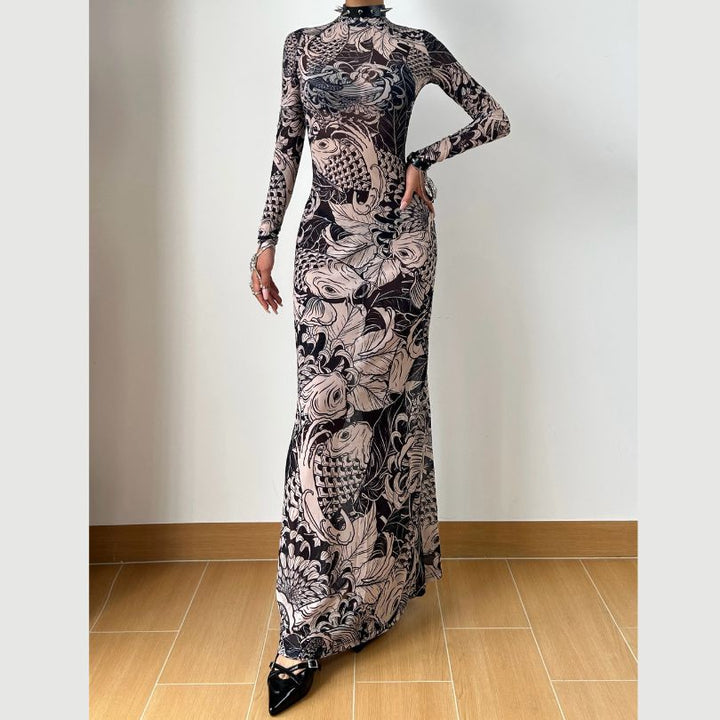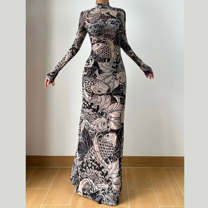 透け感のあるメッシュのアブストラクトな長袖ハイネックマキシドレス サイバーパンク SF パンク ファッション サイバーパンク SF ファッション