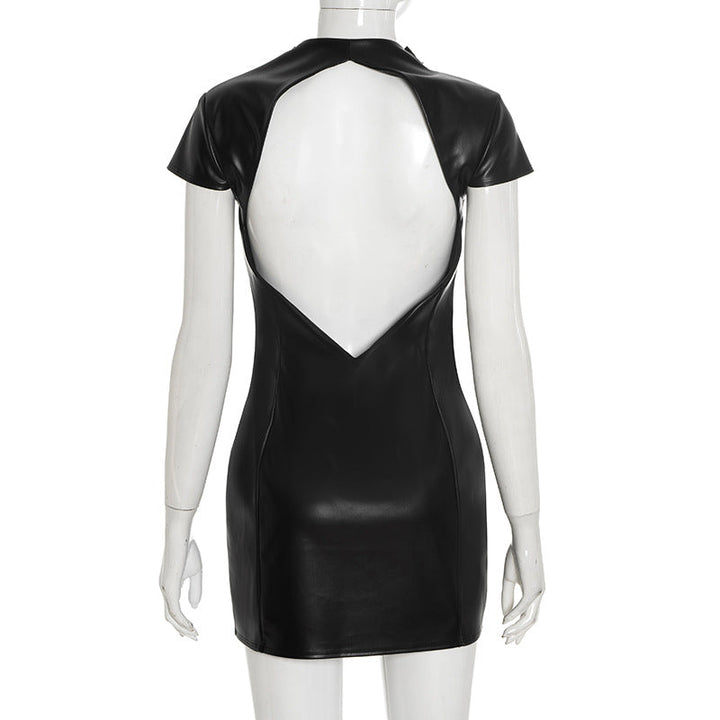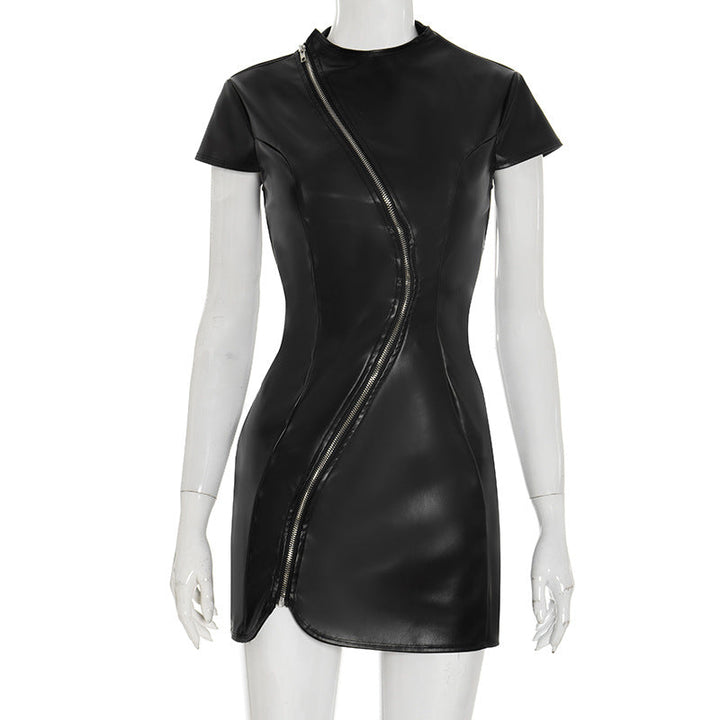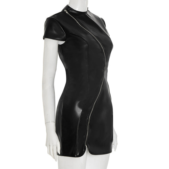 Crewneck PU leather zip-up short sleeve mini dress