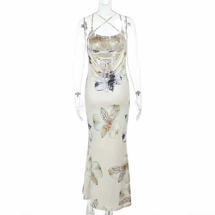 Flower print cross back lace up cami maxi dress