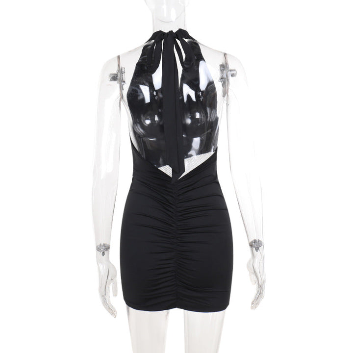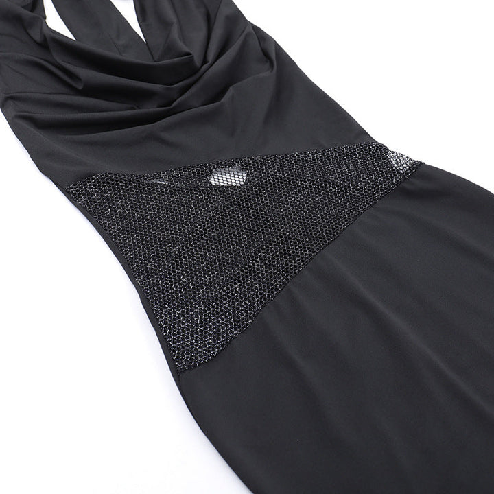 Halter cowl neck fishnet patchwork ruched maxi dress