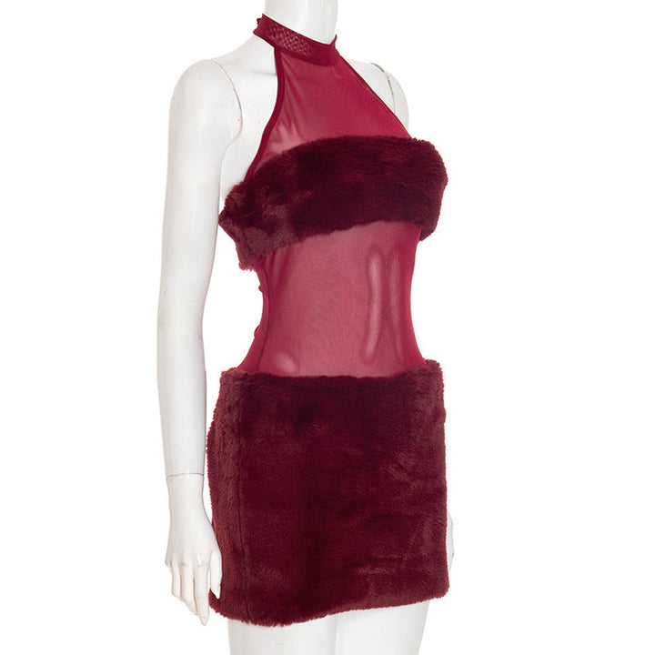 Halter fluffy mesh patchwork mini dress