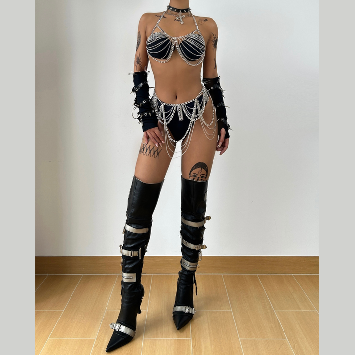 3 piece mini skirt set:Long flared sleeve PU leather rivet metal chain shrug 3 piece mini skirt set