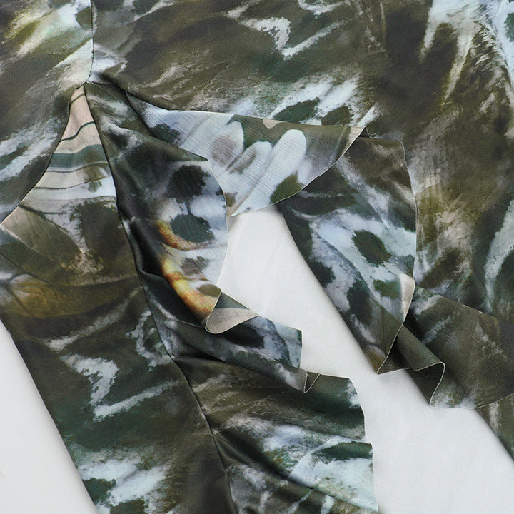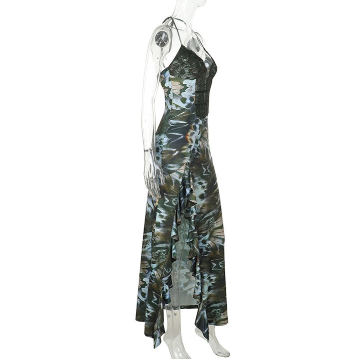 Halter self tie ruffle print v neck maxi dress