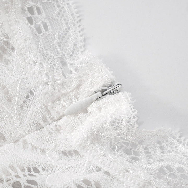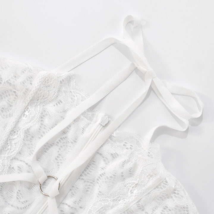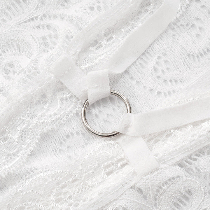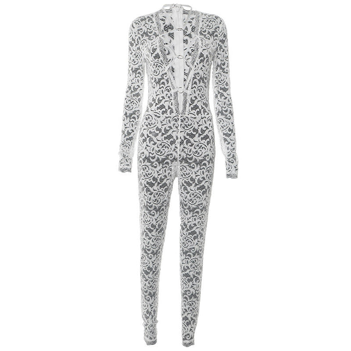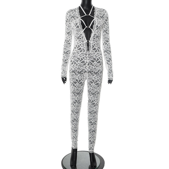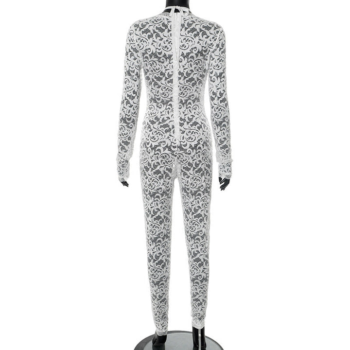 Hollow out o ring lace long sleeve self tie jumpsuit