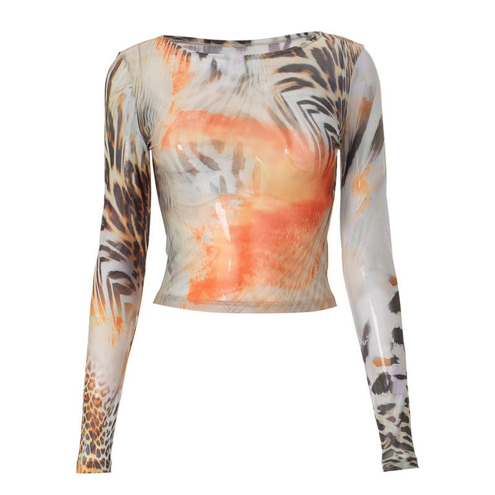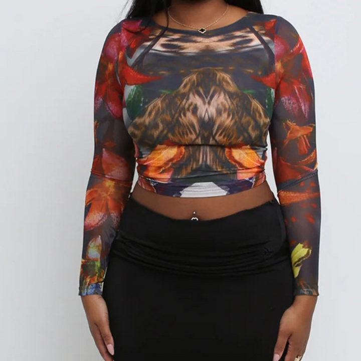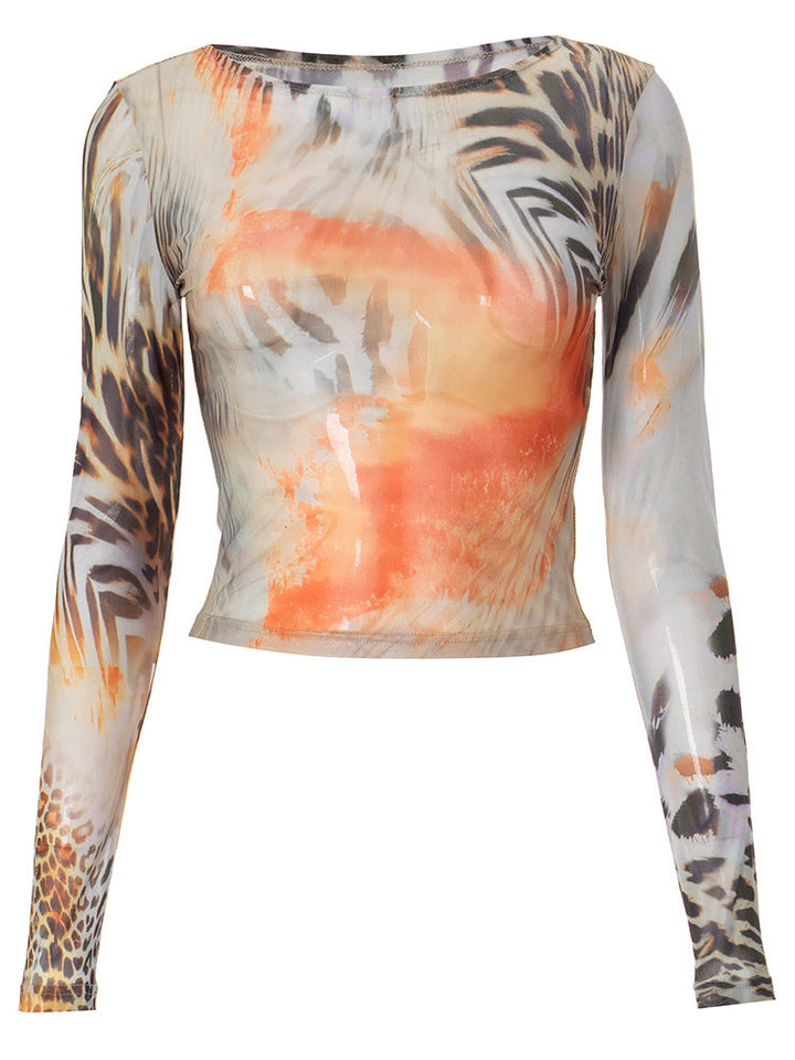 Long sleeve crewneck print mesh top
