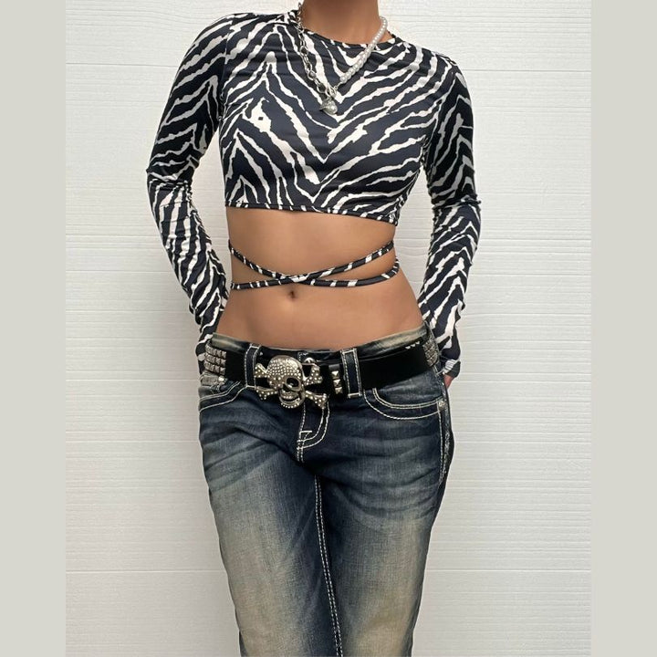 長袖ラウンドネックセルフタイオープンバッククロップトップy2k90年代リバイバルテクノファッション