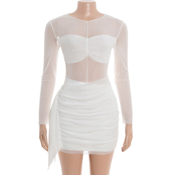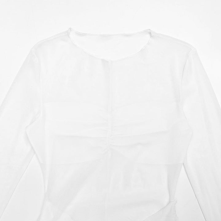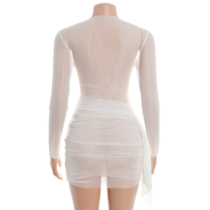 Long sleeve ruched mesh mini dress