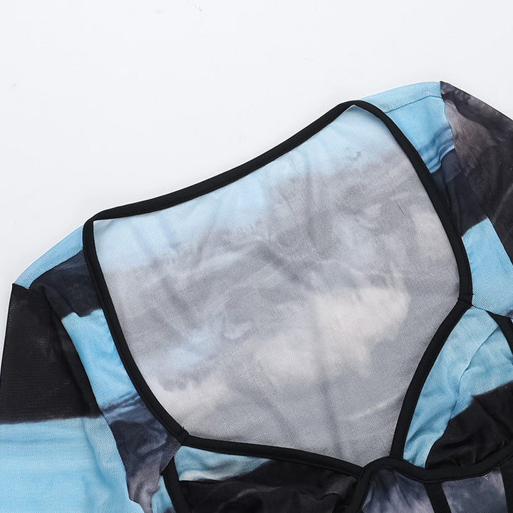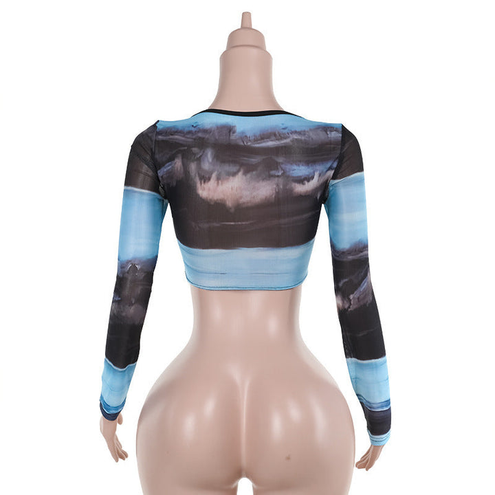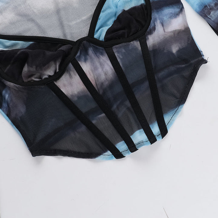 Long sleeve v neck print mesh bustier top