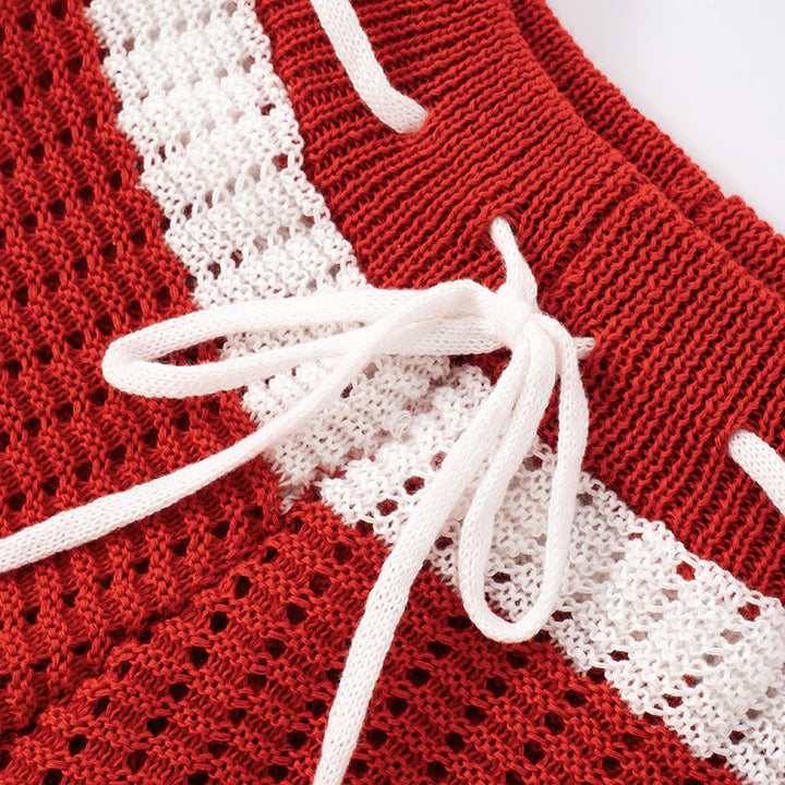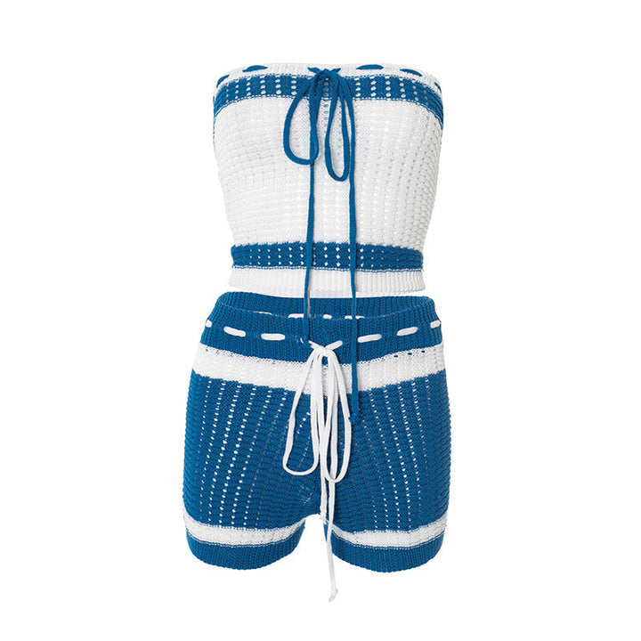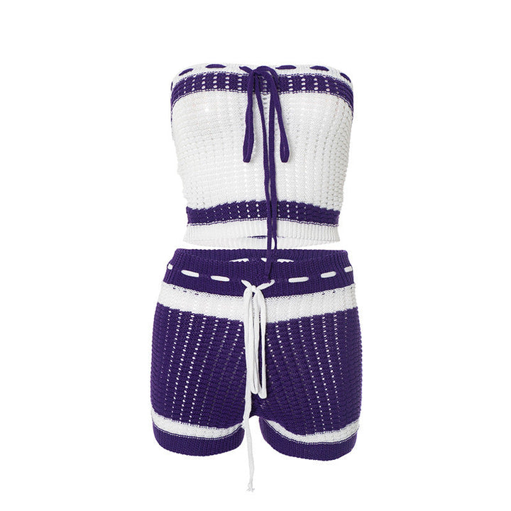 Self tie hollow out striped medium rise tube pant set