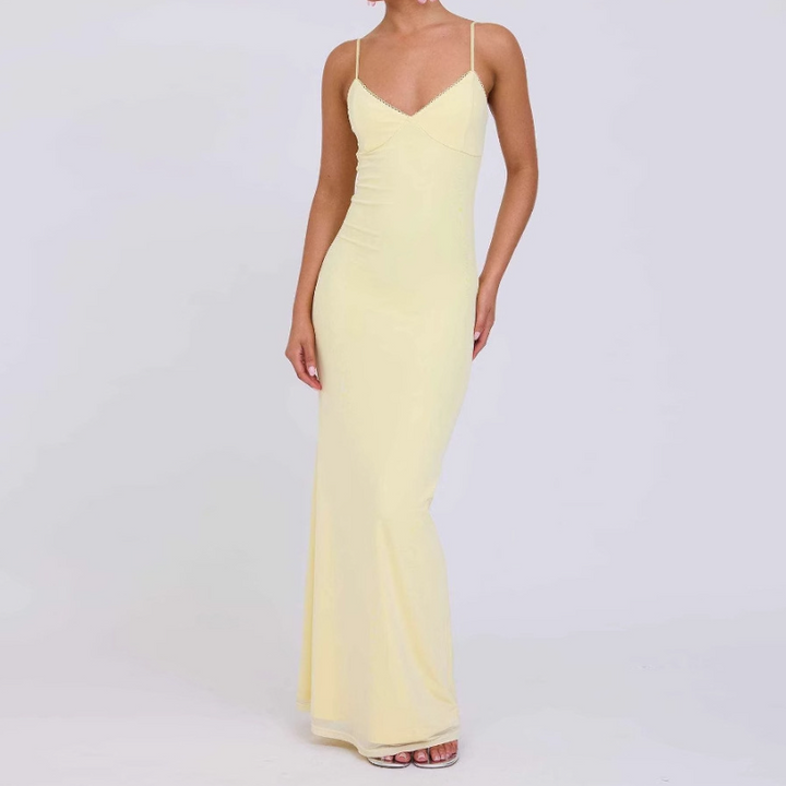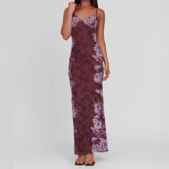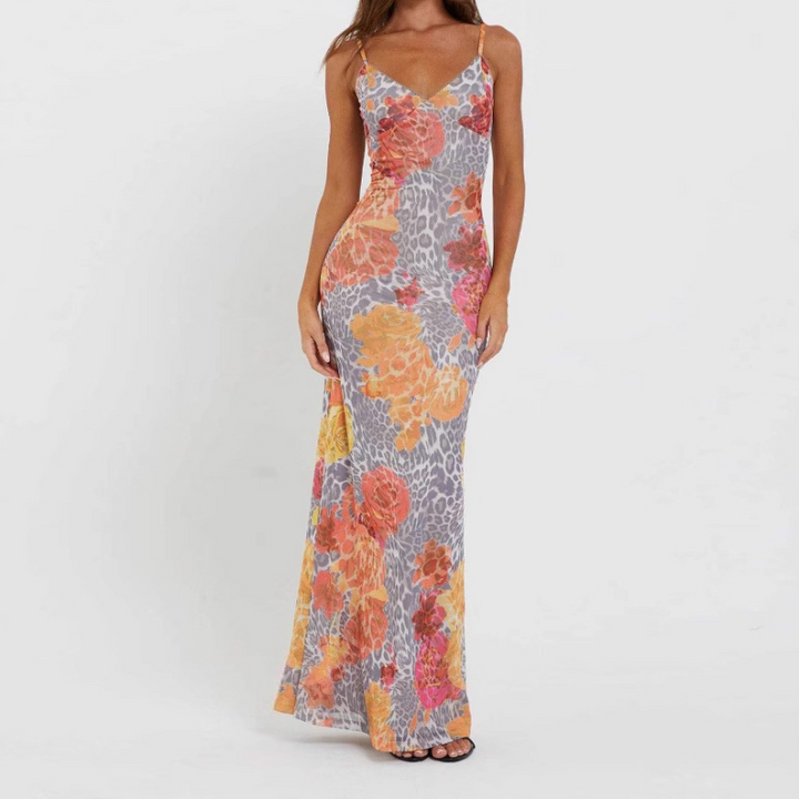 V neck flower print backless cami maxi dress